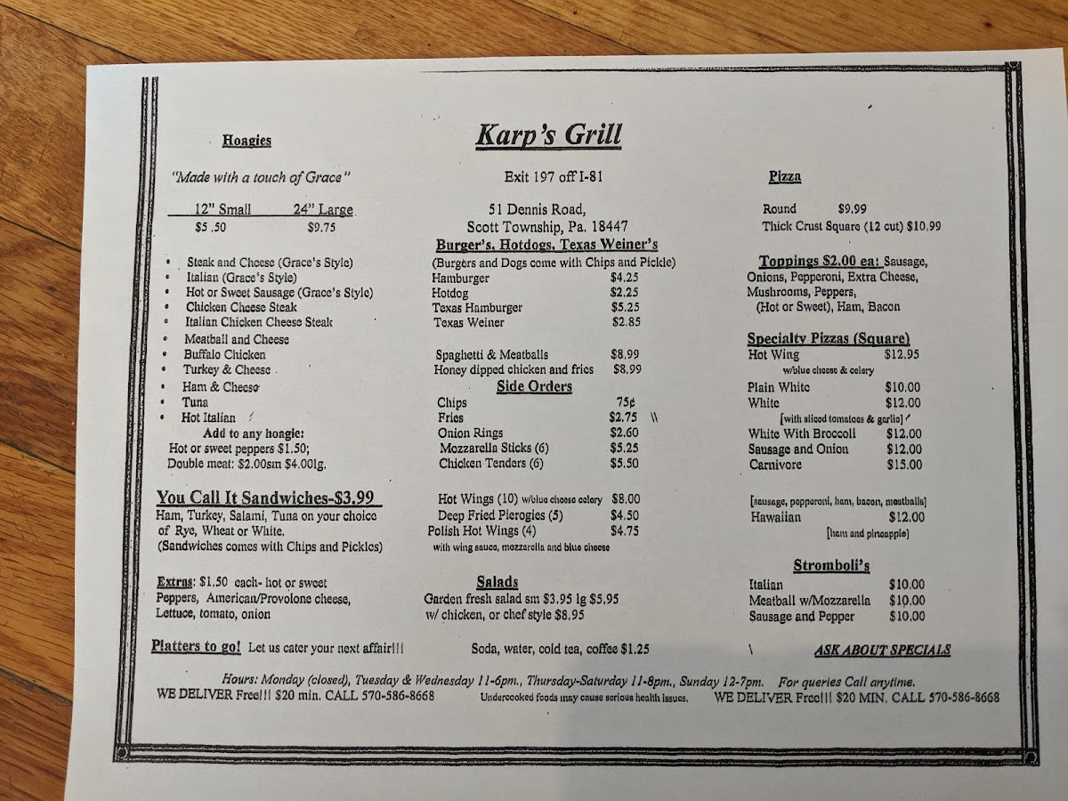 If you're looking for a laid-back dining experience with a menu full of bold, flavorful options, Karp's Grill Menu is the place to be. Located at 51 Dennis Rd, Scott, PA, this spot is all about good food and great vibes. Whether you're in the mood for a juicy burger, fresh seafood, or a satisfying vegetarian dish, you'll find something that hits the spot. The menu has a variety of choices, from classic comfort foods to unique twists that’ll surprise your taste buds. The laid-back atmosphere makes it perfect for everything from a casual meal to a gathering with friends or family. So, grab a seat, dive into the delicious dishes, and enjoy the cozy, welcoming vibe of Karp's Grill.
